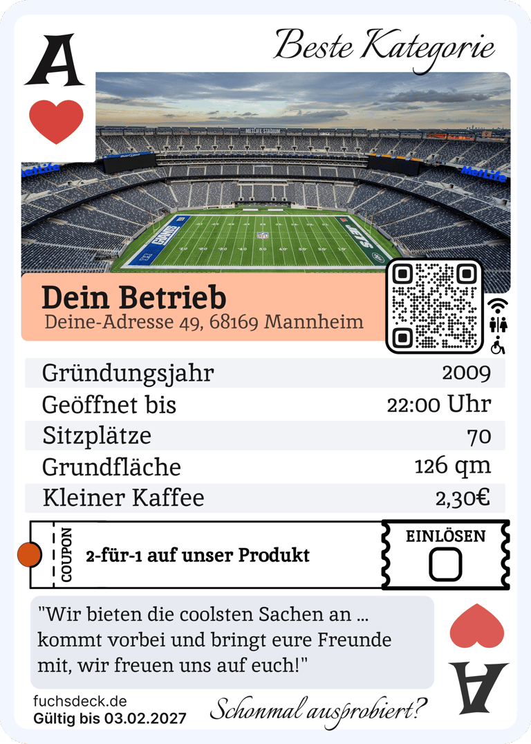 Werde Teil einer Kultur Rhein-Neckars, die Menschen und Betriebe unserer Region verbindet: In einem Kartenset mit 34 Karten bilden wir Betriebe in politisch und religiös neutralen Kategorien wie Restaurants, Cafés, Parks, Sport, Tanz, Theater, Kino, Wellness, Abenteuer und mehr ab. Diese Kartensets werden unseren Kunden die Vielfalt der Region im wahrsten Sinne des Wortes vor Augen führen!